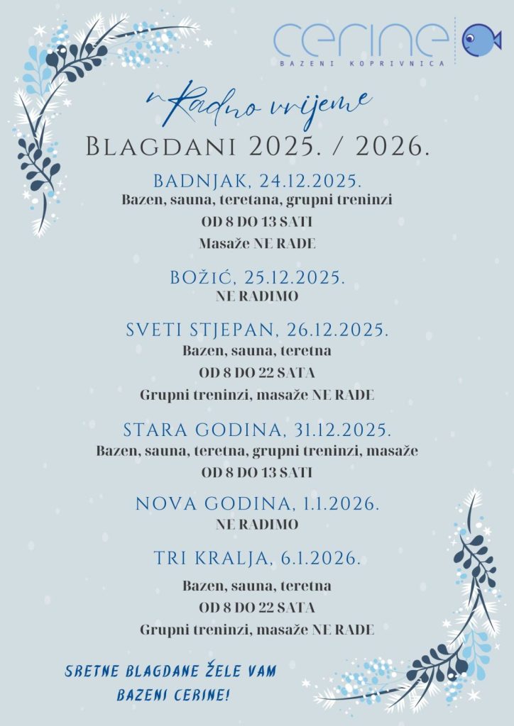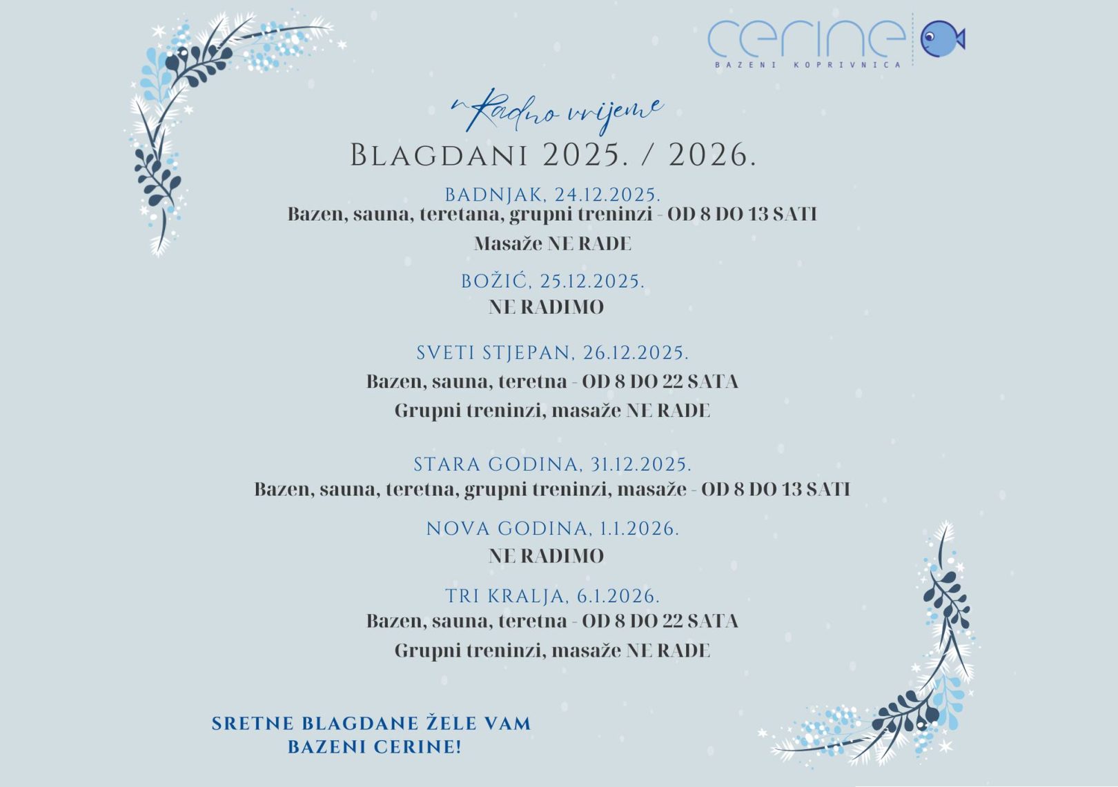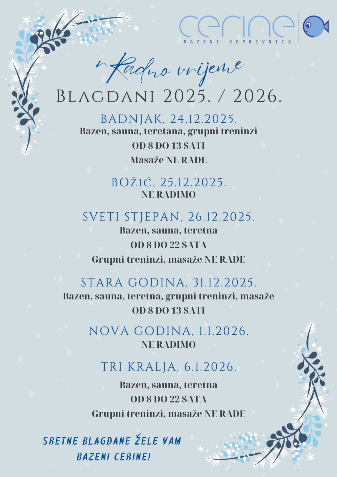Novosti Blagdani 2025./2026. – radno vrijeme Written by Sonja Markić Poštovani korisnici, Bazeni Cerine neće raditi na Božić i Novu godinu, ostale dane radimo prema redovnom ili izmijenjenom rasporedu kojeg možete vidjeti u nastavku.