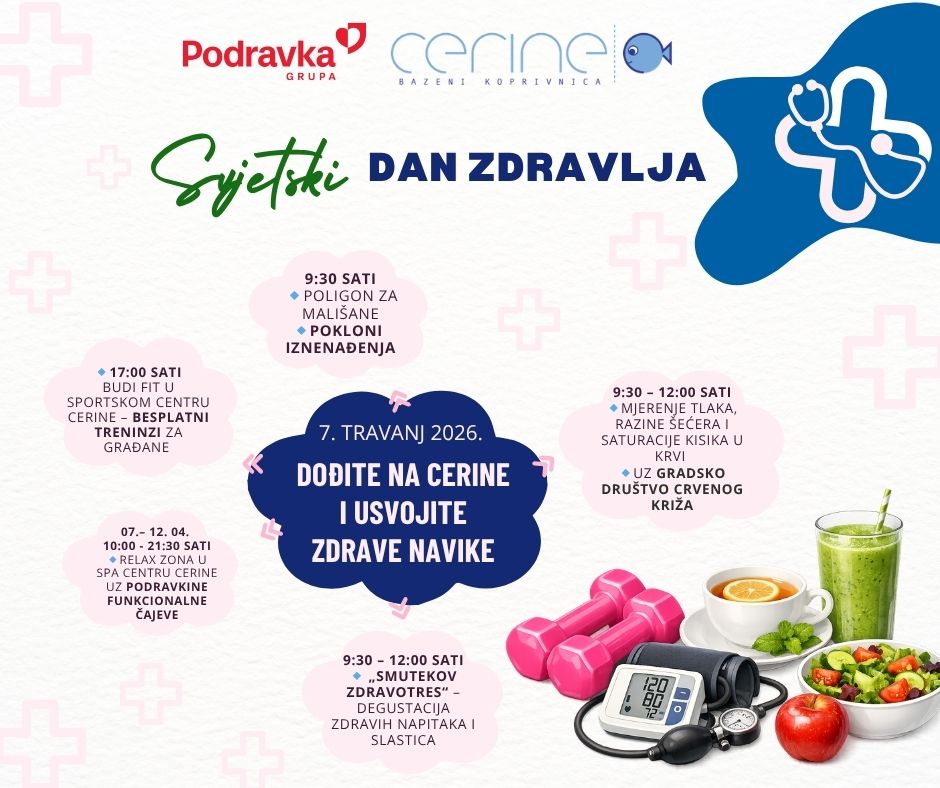 U utorak, 7. travnja, povodom Svjetskog dana zdravlja, Gradski bazeni Cerine u suradnji s Podravkom i Gradskim društvom Crvenog križa Koprivnica obilježit će Svjetski dan zdravlja na Cerinama – značaj tjelovježbe i zdravog načina života.
